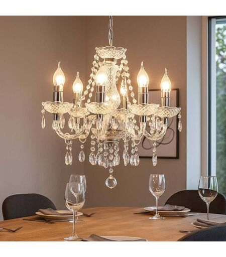 NINO LEUCHTEN Lustre suspension lampe de salon lampe de table à manger Lustre 5 flammes, métal chromé, cristaux acryliques transparents, 5x E14, DxH 45 x 150 cm
