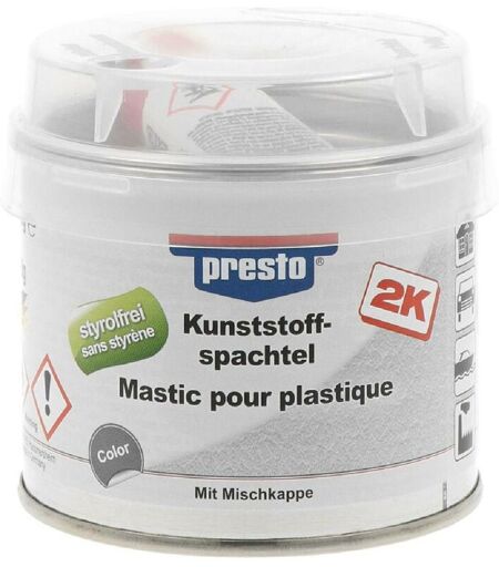 Le Mastic pour plastiques presto sans styrène est un mastic en polyester noir bicomposant conçu pour effacer les rayures et dommages et pour post-traiter les pièces en plastique collées. Rebouche définitivement les petites et moyennes surfaces endommagées sur presque tous les plastiques (PP, PUR, ABS, PA, PVC). Grâce à ses agents de thixotropie et sa souplesse, les profils et les contours peuvent facilement être reconstruits. ...