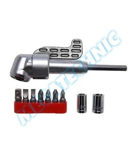 Renvoi d'angle pour visseuse et perceuse, très utile pour arriver aux vis difficilement accessibles. Contenu : - 1 renvoi d'angle - 6 embouts dont : 4 cruciformes et 2 plats - 1 adaptateur : 1/4 (6.3 mm) - 2 douilles : 8 et 10 mm ...
