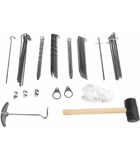 Réf. : 46018 - Lot de 48 accessoires de tente : maillet, tendeurs, corde, piquets, goupilles de piquet, et extracteur de piquet Tout savoir sur l'article Accessoires de tente 48 pièces de la marque CALIMA : Lot de 48 accessoires de tente pour remplacer ou compléter votre équipement de camping. Différents types d'accessoires, pour s'adapter à tous types de terrain. Vendu avec un sac en nylon, de haute qualité et résistant à l'usure. Contenu du pack CONTENU DU PACK : - 1 Maillet en caoutchouc. - 1 Extracteur de chevilles. - 3 Pinces à trois trous en aluminium. - 2 Grandes Boucles de chevilles en aluminium. - 1 Corde de tente d'environ 20 m (diamètre d'environ 4 mm). - 10 Piquets de tente pour sol dur d'environ 23 cm x 6 mm. - 10 Piquets de tente pour sol normal environ 24 cm x 4,3 mm. - 10 Piquets de tente pour sol mou d'environ 19,5 cm x 18 mm. - 10 Piquets de tente pour sols sablonneux environ 22,5 cm x 15 mm. ...