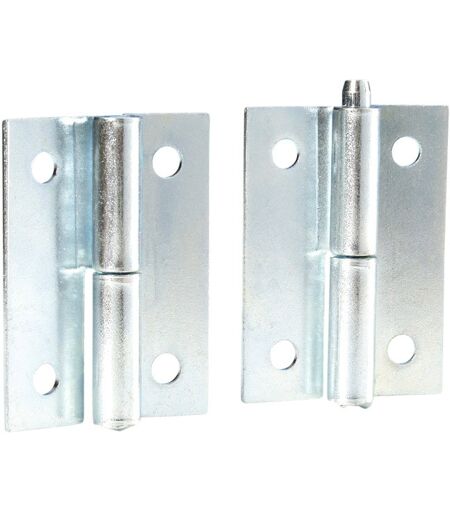 Charnière Dégondable petite zinc: Paire de charnières dégondables avec un axe court et un axe long permettant un enfilage facile du couvercle. À utiliser sur le côté droit dans le cas d'un montage vertical., Données techniques: Type de produit: Charnières et arrêtoirs, Type: Charnières, Matériau: Acier, Finition Surface: galvanisé, Épaisseur matériau: 1,8 mm, Ø trous de fixation: 5 mm, Largeur: 38 mm, Hauteur (mm): 55 mm, Détachable: Oui, Poids: 0,072 kg ...