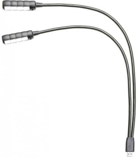 Lampe col de cygne à LED avec connecteur USB: Lampe à col de cygne avec connecteur USB, 8 LED COB blanches particulièrement lumineuses, Luminosité réglable sur 3 niveaux, Deux cols de cygne de 45 cm de long, Cette lampe flexible peut fonctionner sur n’importe quel port USB de type A et convient parfaitement aux consoles de mixage ou racks. Ses deux cols de cygne mesurent 45 cm de long et s’orientent vers les zones à éclairer en toute flexibilité. Chaque col de cygne est équipé de 4 LED COB d’une grande intense luminosité et d’un interrupteur marche/arrêt individuel. Données techniques: Type de produit: Accessoires 19" pour rack, Nombre de LED: 8, Couleur de LED: Blanc froid, Longueur col de cygne: 450 mm, Interrupteur: Oui, Températures de couleur: 6000 - 6500 K, Courant absorbé (mA): 100, Consommation électrique: 0,48 W, Alimentation: par connecteur USB, Alimentation optionnelle par bloc secteur: Oui, Poids: 0,22 kg, Informations complémentaires: 8 LED COB extrêmement lumineuses ...