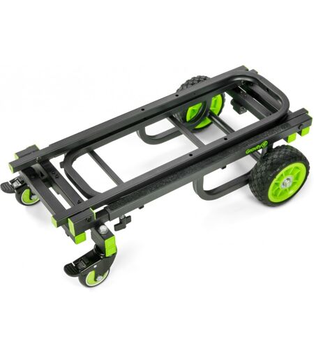 Chariot multifonctionnel (moyen): Configuration 8 en 1, Simplicité d'utilisation grâce à sa forme ergonomique, Conception compacte (670 x 405 x 805 mm), Possibilité d'extension aisée jusqu'à 0,98 m de long, Capacité de charge maximale de 150 kg, Transport facile grâce à son faible poids, Pneus en caoutchouc (PU) haute résistance pour une flexibilité totale sur différents sols, Un équipement lourd transporté en toute légèretéQue vous soyez ingénieur du son, DJ ou membre d'une équipe de techniciens de scène, un chariot multifonction est le moyen de transport idéal pour vous délester au maximum lors des opérations de montage et de démontage. Le châssis en acier du Gravity Cart est un gage de stabilité. Ses roues en caoutchouc, dont deux fixes et deux pivotantes, présentent une faible résistance au roulement et sont antidérapantes, ce qui garantit une agréable maniabilité. Le Gravity Cart est ainsi une aide précieuse et indispensable avant et après le spectacle. Son atout phare: très facile à sortir du bus de tournée en position repliée grâce à ses dimensions compactes, le chariot multifonction est tout aussi convaincant une fois chargé. Grâce à sa surface de base extensible à 0,98 m et à sa capacité de charge élevée de 150 kg, vos équipements techniques seront désormais montés et démontés très rapidement et, surtout, en toute sécurité. Qui plus est, votre dos ne souffre pas, grâce à une ergonomie optimale. Données techniques: Type de produit: Chariot multifonctionnel, Matériau poignée: Acier, Couleur poignée: noir, Matériau rallonge: Acier, Dimensions déplié (L x l x H): 670 x 405 x 805 mm, Dimensions plié (L x l x H): 720 x 405 x 195 mm, Dimensions de la zone de chargement: (560 - 875) x 405 x 805 mm, Nombre de tiges télescopiques: 2, Longueur (mm): 670 - 980 mm, Roues avant Ø: 76,2 mm, Roues arrière Ø: 152,4 mm, Matière roues avant: Caoutchouc, Matériau des roues arrières: PU, Max. Longueur de rallonge: 980 mm, Largeur de piste: 410 mm, Résistance maximale: 150 kg, Poids: 11 kg ...
