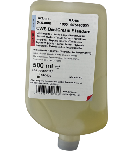 CWS Savon Crème Paradise Crème Slim Numéro d'article : 5463000 CWS Paradise Crème Slim Standard jaune Parfum de citron Flacon de 500 ml Niveau de PH neutre hydratant biodégradable CWS Savon crème "Standard": - a un parfum de citron rafraîchissant - nettoie en profondeur - Peut être utilisé dans différents domaines - même avec des salissures plus importantes ...