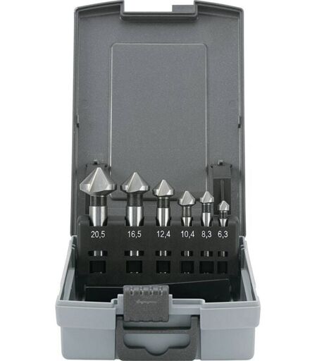 Informations techniques Angle : 90 ° Diamètre de tige : 5 mm, 6 mm, 8 mm, 10 mm Mandrin porte-outil (perceuse) : tige cylindrique Matériau (perceuse) : HSS Norme DIN : DIN 335-C compatibilité du matériau : métal diamètre (fraise) : 6.3 mm, 8.3 mm, 10.4 mm, 12.4 mm, 16.5 mm, 20.5 mm Set de 6 fraises coniques 90° HSS Pour fraiser et ébavurer. Fonctionnalités Fraise conique à 90° HSS avec tête fraisée conforme à DIN 335 forme C. Avec queue cylindrique et 3 taillants. Contenu de la livraison Ø 6,3/8,3/10,4/12,4/16,5/20,5 mm Boîtier en plastique. Configuration requise null ...