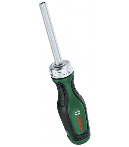 Tournevis à cliquet à couple élevé pour vissages performants Fonction cliquet avec mécanisme à 36 dents pour disposer d’un couple jusqu’à 50 Nm Vissage performant avec tige de 80 mm et porte-embout magnétique Design ergonomique et revêtement softgrip pour une maîtrise parfaite et une force optimale Bague métallique intuitive permettant de commuter entre rotation gauche, rotation droite et position médiane (pour vissages manuels) Avec magasin amovible contenant 12 embouts de différentes formes en acier S2 à codage couleur Caractéristiques techniques • Diamètre de manche: 40 mm • Longueur de tige: 80 mm • Diamètre de tige: 10 mm • Matériaux: Chrome Vanadium • Pointe magnétique: True • Dimensions (L x l x H): 207 x 38 x 40 mm • Poids: 0,200 kg • Profil: PH, Plat, TX, PZ Le tournevis à cliquet puissant et ergonomique pour visser avec précision jusque dans les espaces exigus Le tournevis à cliquet Bosch avec 12 embouts logés dans le manche est unique en son genre et conçu pour visser sans effort avec une maîtrise totale. Le cliquet est doté d’un mécanisme fritté à 36 dents permettant de visser avec un couple jusqu’à 50 Nm. Une bague métallique intuitive permet de changer de direction rapidement par simple rotation de la gauche vers la droite. La position médiane permet d’effectuer des vissages manuels sans cliquet. Le porte-embout magnétique assure un maintien ferme des embouts dans la tête de vis lorsqu’une force plus élevée est appliquée. Ce tournevis est doté d’une tige de 80 mm pour un travail facile et précis. Le manche de ce tournevis très pratique intègre un magasin amovible pouvant contenir 12 embouts en acier S2 dur à codage couleur avec différentes formes d’empreintes (PH, PZ, Plat, TX, HEX). Pour plus de confort et une meilleure prise en main, ce tournevis à cliquet est compact et ergonomique avec un manche bimatière et de grandes zones softgrip. > ...