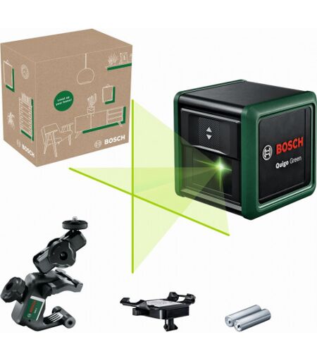 Feu vert pour vos idées ! Technologie laser vert pour une visibilité jusqu’a 4 fois meilleure qu’avec des lignes laser rouges, meme dans des conditions de forte luminosité Précision améliorée de +/- 0,6 mm/m et portée maximale de 12 m Positionnement facile avec l’accessoire fourni. Parfait pour suspendre des cadres photos, fixer des tringles a rideaux et installer des meubles de cuisine Dispose de caractéristiques écoresponsables, voir ci-dessous pour plus de détails Accessoires fournis 2 piles 1,5V LR03 (AAA) Pince universelle MM 2 (0 603 962 203) Adaptation de fixation rapide Carton eCommerce Caractéristiques techniques Diode laser 500 – 540 nm Classe laser 2 Durée de la mise a niveau automatique, typ. 6 s Plage de mise a niveau automatique ± 4 ° Angle d’ouverture 85 ° Précision** ± 0,6 mm/m Filetage du trépied 1/4" Poids 0,270 kg Pile 2 x 1,5-V-LR03 (AAA) Dimensions (L x l x H) 65 x 65 x 65 mm Profitez de la grande facilité d’utilisation et de la visibilité élevée du laser lignes Quigo Green Passez au vert avec le laser lignes nouvelle génération Quigo Green de Bosch alliant bonne visibilité et grande facilité d’utilisation pour les projets créatifs et de bricolage. Avec ses lignes laser en croix de couleur vert intense, le Quigo Green est la solution parfaite pour effectuer des alignements par tres forte luminosité. Il se distingue par sa porte de plus de 12 m et sa précision améliorée de +/- 0,6 mm/m. Le laser lignes est fourni avec un accessoire facilitant l’utilisation dans un grand nombre d’applications. La Quigo Green s’auto-nivelle dans une plage de +/-4° pour permettre le positionnement précis de miroirs, étageres ou carrelages. > ...