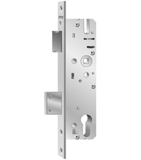 Serrure à mortaiser 59-PZW pour portes à montant étroit Avec pne de scurit, protg contre le sciage en ouverture par deux goupilles en acier. Dispositif de lubrification avec serrure bille, 2 tours, utilisable droite et gauche par loquet rversible, exclusion du pne 25 mm, botier galvanis, distance : 92 mm, fourche : 24 x 245 mm, angulaire, PZ avec changement. ...