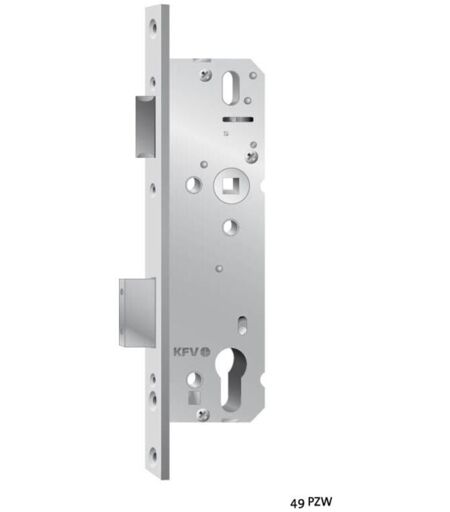 Serrure à mortaise n° 49N-PZW pour portes à montant étroit préparée pour cylindre profilé, avec changement (PZW), exclusion du pne 20 mm, 1 tour, droite et gauche utilisables par pne rversible, pne et dormant nickels brillants, dormant avec protection contre la scie par goupilles en acier insres, botier galvanis, distance 92 mm, avant-corps angulaire. ...