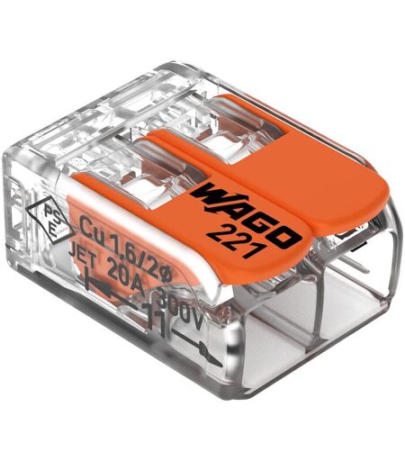 Borne de raccordement compacte Wago 221-412 Borne de raccordement COMPACTE pour tous types de conducteurs max. 4 mm² 2 conducteurs avec leviers Couleur du boîtier transparent Température ambiante max. 85 °C (T85) 4,00 mm² transparent ...