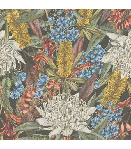 As Creation - Papier peint nature coloré blanc, bleu, jaune, rouge Tapisserie fond vert foncé style tropical Papier peint intissé idéal salon