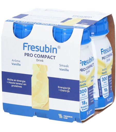 Il est important d'avoir une alimentation variée et équilibrée et un mode de vie sain.Boisson hypercalorique (2,4 kcal/ml) et hyperprotéinée (18 g de protéines par flacon), riche en calcium et vitamine D. Sans gluten, pauvre en lactose. Saveur cappuccino. Conçue pour les besoins nutritionnels des patients en cas de dénutrition ou risque de dénutrition. À utiliser sous contrôle médical.IngrédientsEau, sirop de glucose, protéines de LAIT, huiles végétales (huile de colza, huile de tournesol), saccharose, arômes, émulsifiants (E471, lécithines de SOJA), régulateurs d’acidité (E500, E501), vitamine C, stabilisants (E460, E466), diphosphate ferrique, sulfate de zinc, niacine, sulfate de cuivre, riboflavine, vitamine E, acide pantothénique, fluorure de sodium, vitamine B6, chlorure de chrome, chlorure de sodium, molybdate de sodium, sélénite de sodium, biotine, vitamine K, vitamine D, vitamine B12.Allergènes : Soja, Lait.Valeurs nutritionnelles Pour 125 mlPour 100 ml Énergie300 kcal240 kcal Protéines18 g14,4 g Lipides11,2 g9,0 g Glucides30,6 g24,5 g Fibres0 g0 g Conseils d'utilisationBien agiter avant emploi. À boire frais de préférence. Posologie habituelle : 2 à 3 flacons par jour ou selon recommandation médicale. Après ouverture, conserver au réfrigérateur et consommer dans les 24 h.Précautions d'emploiÀ utiliser sous contrôle médical. Ne convient pas comme seule source d’alimentation. Ne pas administrer aux enfants de moins de 3 ans et à utiliser avec précaution chez les enfants de moins de 10 ans. Ne pas utiliser chez les patients atteints de galactosémie.Poids net4 x 125 ml = 500 mlAdresse du FabricantFresenius Kabi N.V./S.A.Brandenburgweg 9B-2627 SchelleBelgique ...