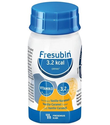 Il est important d'avoir une alimentation variée et équilibrée et un mode de vie sain.Alimentation buvable, complète, hypercalorique (3,2 kcal/ml) et hyperprotéinée (20% AET), riche en vitamine D.Sources de nutriments Lipides: huile de colza Glucides: sirop de glucose, saccharose Fibres: cellulose (insolubles: 100%)* Protéines: hydrolysat de collagène, protéines de laitIndications:Pour couvrir les besoins nutritionnels des patients dénutris ou à risque de dénutrition, en particulier les patients présentant des besoins protéiques et énergétiques accrus et/ou nécessitant une restriction hydrique.Composition: Eau, sirop de glucose, l’huile de colza, hydrolysat de collagène**, saccharose, protéines de lactosérum, maltodextrines, stabilisants (E 460, E 466), arômes, émulsifiants (E 471, lécithines de soja, E 472e), phosphate de calcium, chlorure de potassium, régulateurs d’acidité (E 524, E 525), hydro-génophosphate de potassium, citrate de potassium, vit. C,citrate de calcium, chlorure de magnésium, oxyde de magnésium, pyrophosphate de fer, chlorure de sodium, sulfate de zinc, niacine, chlorure de manganèse, vit. E, acide pantothénique, sulfate de cuivre, fluorure de sodium, vit. B2, vit. B6, vit. B1, ß-carotène, vit. A, chlorure de chrome, acide folique, molybdate de sodium, iodure de potassium, sélénite de sodium, vit. K1, biotine, vit. D3, vit. B12.**certifié HalalValeur nutritionnelle: 100 ml 125 ml Energie kcal/kJ 320 / 1344 400 / 1680 Lipides g 16 20 Saturés g 1,1 1,38 Mono-insaturés g 9,9 12,4 Poly-insaturés g 5,0 6,3 TCM g - - Acide linoléique g 3,3 4,12 Acide α-linolénique g 1,5 1,88 EPA + DHA g - - ω6/ω3 2,3:1 2,3:1 Glucides g 28 35 Sucres g 10,8 13,5 Lactose g <0,24 <0,3 Fibres g 0,5 0,63 Protéines g 16 20 Sel g 0,28 0,35 Eau ml 56 70 Osmolarité mOsmol/l 630-730 630-730 Minéraux Sodium mg 12 140 Potassium mg 312 390 Chlorure mg 144 180 Calcium mg 160 200 Magnésium mg 40 50 Phosphore mg 112 140 Oligo-éléments Fer mg 4,8 6 Zinc mg 3,5 4,4 Cuivre µg 512 640 Manganèse mg 1,2 1,44 Iode µg 44,8 56 Molybdène µg 30,4 38 Chrome µg 23 28,8 Fluor mg 0,4 0,52 Sélénium µg 23 28,8 Vitamines Vitamine A µg 295 369 ß-Carotène µg 71 89 Vitamine D3 µg 8 10 Vitamine E mg 5,76 7,2 Vitamine K1 µg 20,8 26 Vitamine B1 mg 0,5 0,6 Vitamine B2 mg 0,51 0,64 Vitamine B6 mg 0,58 0,72 Vitamine B12 µg 1,1 1,4 Vitamine C mg 41,6 52 Biotine µg 14,4 18 Acide folique µg 67,2 6,75 Niacine mg 5,4 7,75 Acide pantothénique mg 1,92 2,4 Choline mg - - Conseil d'utilisation: Dosage en nutrition orale partielle: 1 à 2 bouteilles (400-800 kcal) par jour. Dosage en nutrition orale complète: 4 à 5 bouteilles (1600-2000 kcal) par jour.Précautions d'emploi:Ne convient pas aux enfants de moins de 3 ans.Utiliser avec précaution chez les enfants de moins de 6 ans.Ne convient pas aux patients atteints de galactosémie.Sans gluten et cliniquement sans lactose.Poids net: 4 x 125 ml = 500 mlFabricant: Fresenius Kabi FranceDivision Nutrition Entérale et Orale31676 Labège... ...
