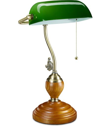 Lampe de banquier interrupteur à tirette, abat jour inclinable, socle bois, design retro, douille E27, bureau. - Relaxdays