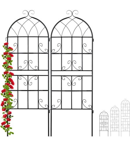 Ce treillis de jardin en lot de 8 soutient non seulement la croissance des plantes grimpantes, mais contribue aussi avec ses belles lignes et formes à un aménagement décoratif de jardin. Les plantes grimpantes comme le lierre, les roses, la clématite ou la vigne seront mis en avant grâce à cette arche rosier en métal. Décidez vous-même si vous voulez mettre en place les éléments individuellement ou ensemble. Les treillis sont simplement plantés dans le sol et peuvent être reliés entre eux par les charnières. Treillis de jardin en détails - Dimensions variante 150 cm H x L x P : env. 150 x 50 x 1,5 cm / env. 1,9 kg - Largueur charnières inclues : env. 52 cm - Largueur totale éléments reliés : env. 104 cm - Espace avec le sol : env. 30 cm - Matériau : Fer laqué - Couleur : Noir Treillis décoratif noir en métal - Pour les plantes d’agrément ou les plantes utiles - Améliore la croissance de vos plantes et leur offre un support - Avec un motif orné, décoratif qui attire l'attention - À ...