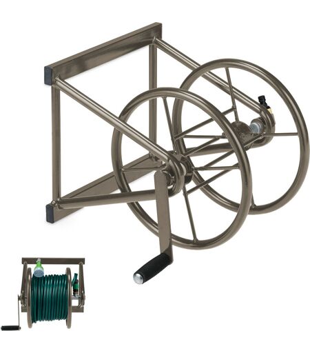 Relaxdays Dévidoir mural, acier, pour 60 m de tuyau d’arrosage, raccords 3/4'', enrouleur, HxLxP 36 x 55 x 50 cm, brun