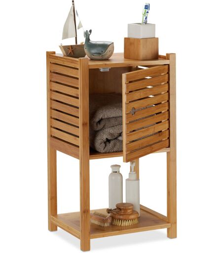 Relaxdays Etagère de salle de bain en bambou, 2 rangements & 1 compartiment avec porte, meuble de bain HlP 62,5 x35x29cm