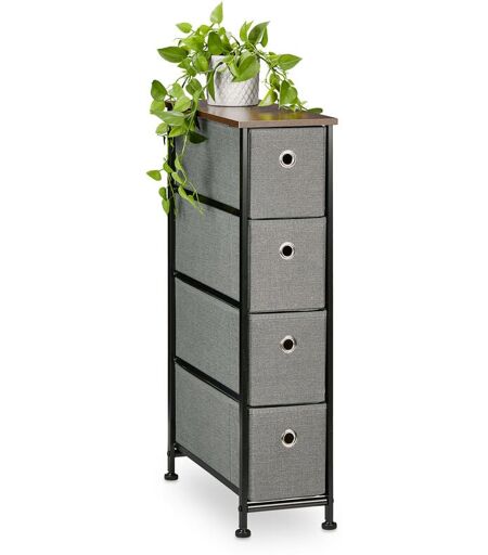 Gagnez de la place grâce à cette jolie petite commode à 4 tiroirs. Agrémentez la surface à l’aide d'une plante ou de bibelots et rangez vêtements, livres et autres objets personnels en ordre et à l’abri de la poussière dans les tiroirs. Grâce à sa taille compacte, ce petit meuble saura se rendre indispensable dans la chambre, le salon ou le couloir. Le design intemporel de ce buffet mélange tissu gris, matériau effet bois et cadre en métal noir et se fondra parfaitement dans un intérieur de style industriel. Commode à 4 tiroirs en détail - Dimensions H x L x P : env. 76 x 20 x 48 cm - Dimensions intérieures des tiroirs H x L x P : 15,5 x 15,5 x 45 cm - Charge maximale surface supérieure : 6 kg - Capacité de charge par tiroir : max. 3 kg - Poids : env. 4,6 kg - Matériaux : acier, MDF, polyester - Couleurs : gris foncé, brun foncé, noir Meuble de rangement au style industriel - Espace de rangement pratique pour les petites pièces et les recoins - Convient parfaitement dans un coin grâce ...