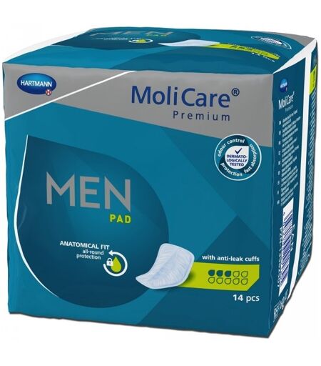 Hartmann Molicare Premium Men Pads 3 gouttes Protection anatomique masculine pour incontinence urinaire légère. • Très discret à porter sous les vêtements. • Coussin Dry-Plus super absorbant. • Neutralise les mauvaises odeurs. • Épouse la forme du corps. • Fixation optimale avec adhésif large. • Forme adaptée aux hommes. Longueur Absorption Conditionnement Molicare Premium Men Pads 2 gouttes 13 cm x 15 cm 330 ml 14 pièces Molicare Premium Men Pads 3 gouttes 26 cm x 18 cm 406 ml 14 pièces Molicare Premium Men Pads 4 gouttes 18 cm x 34 cm 546 ml 14 pièces Molicare Premium Men Pads 5 gouttes 18 cm x 34 cm 852 ml 14 pièces ...