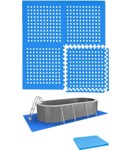 DESCRIPTION GÉNÉRALE Ensemble de tapis de piscine eyepower pour un plaisir aquatique sans souci. Ces tapis robustes protègent votre piscine des épines et des pierres pointues. SPÉCIFICATIONS TECHNIQUES Dimensions : 50 x 50 x 1 cm par tapis Profil antidérapant avec trous de drainage Résistant aux intempéries et aux UV Mousse EVA à 100% UTILISATION Pour déterminer le nombre de tapis nécessaires, divisez la longueur et la largeur de la piscine (en cm) par 50 et arrondissez au nombre entier le plus proche. Multipliez les deux résultats pour obtenir la quantité minimale de tapis requise. ...