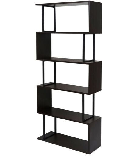 HHG - Bibliothèque 091, étagère de salon, structure 3D 183x80cm, 5 niveaux, marron foncé, métal noir