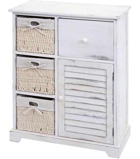 Commode HHG-676, armoire à tiroirs, tiroir panier en bois massif 80x60x30cm ~ blanc miteux - Paniers stables avec housse amovible en tissu - Certifié BSCI - Mur du fond fermé - Surface brossée - Pas de montage nécessaire - Livraison sans décoration - Cette belle armoire polyvalente au look miteux attire l'attention dans votre salon et offre beaucoup d'espace de rangement. En raison de son aspect unique, cette commode met des accents extravagants sur les quatre murs de votre maison. - La commode n'est pas seulement attrayante sur le plan visuel, mais elle offre également, grâce au compartiment de la porte et aux quatre généreux tiroirs, un espace de rangement suffisant pour ranger, par exemple, votre sac à main, votre sac ou vos parapluies. Dimensions (environ) : Total : 80x60x30 cm Dimensions extérieures du tiroir : 22x30x26 cm Dimensions intérieures du tiroir : 20x28x24 cm Compartiment de la porte : 46x30x26 cm Compartiments sans panier : 22x23x26 cm Dimensions extérieures du panier ...