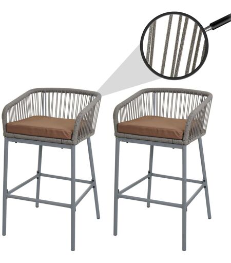 Mendler Lot De 2 Tabourets De Bar Rope Hwc-O22, Tabouret De Bar, Outdoor Assise Rembourrée Corde Tressée Métal Gris Clair, Coussin Taupe