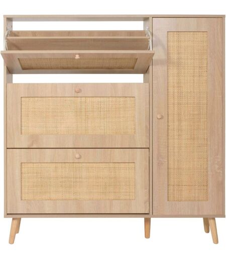 HHG - Meuble à chaussures en rotin 214, étagère à chaussures, 3 compartiments basculants 2 étagères 127x120x24cm bois mélaminé, aspect chêne