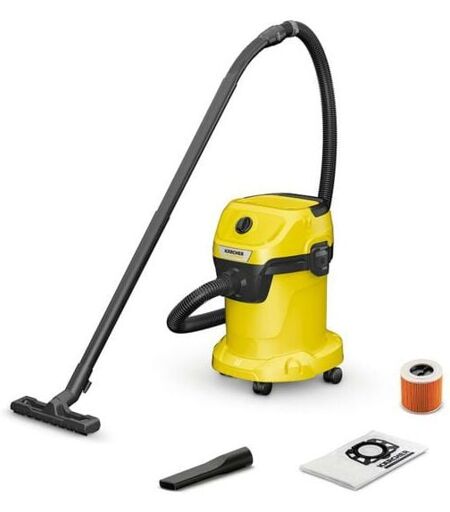 Description générale L'aspirateur polyvalent eau et poussière WD 3 V-17/4/20 de Kärcher est un appareil puissant et efficace, conçu pour répondre à tous vos besoins de nettoyage, à la fois à l'intérieur et à l'extérieur. Avec sa consommation d'énergie de seulement 1000 watts, il offre une puissance d'aspiration de 200 watts et intègre une fonction de soufflage, idéale pour nettoyer les feuilles et autres débris. Sa cuve en plastique robuste de 17 litres et son design compact en font un choix pratique pour un usage domestique ou professionnel. Spécifications techniques Capacité du bac de récupération : 17 litres Dimensions (L x l x H) : 349 x 328 x 492 mm Poids : 4,54 kg Longueur du câble : 4 mètres Longueur du tuyau d'aspiration : 2 mètres Puissance absorbée : 1000 W Tension de fonctionnement : 230 V Matériau : plastique Couleur : jaune/noir Compatibilité et accessoires Filtre à cartouche monobloc pour aspiration humide et sèche sans remplacement Accessoires inclus : suceur pour sols, ...