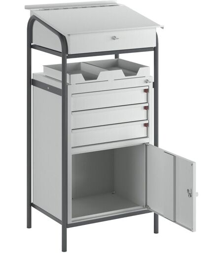 Pupitre d'atelier, 1 armoire, 3 tiroirs, h x l x p 1140 x 590 x 520 mm. Produit livré = monté. Profondeur = 520 mm. Hauteur = 1140 mm. Largeur = 590 mm. Verrouillage = verrouillage central. Nombre de tiroirs = 3 pces. Equipement = pupitre verrouillable, 1 compartiment ouvert, 3 tiroirs, 1 casier. Propriété = verrouillable. Charge max. par tiroir = 20 kg. Coloris = anthracite RAL 7016. Coloris corps = gris clair RAL 7035. Matériau du piétement = tube d'acier, peint époxy. Matériau corps = acier, peint époxy. Hauteur tiroirs = 3x80 mm. Modèles fonctionnels. Modèles fixes ou mobiles (voir accessoires). Coffret et écritoire en tôle d'acier, verrouillable. Pupitres livrés avec 2 bacs en plastique. Piétement en tube d'acier peint époxy anthracite RAL 7016, coffret gris clair RAL 7035. Hauteur x largeur x profondeur 1140 x 590 x 520 mm. Armoire gris clair RAL 7035. Peinture dans toutes les teintes RAL. Supplément de prix seulement 10 %. ...