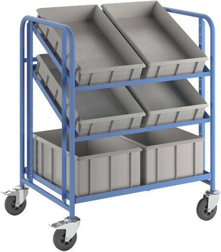 Chariot à tablettes pour bacs normes Europe, avec 6 bacs, L x l x h 885 x 620 x 1100 mm. Produit livré = monté. Nombre de bacs = 6 pces. Hauteur = 1100 mm. Longueur = 885 mm. Largeur = 620 mm. Matériau du piétement = acier. Coloris du piétement = bleu clair RAL 5012. Matériau = construction en tube d'acier, polyéthylène (HDPE). Coloris du conteneur = gris. Bandages = caoutchouc. Train de roulement = 4 roulettes pivotantes, dont 2 avec blocage double. Diamètre roues = 125 mm. Force = 200 kg. Roulement = roulement à rouleaux. Nombre de plateaux = 3 pces. Longueur plateau = 830 mm. Largeur plateau = 610 mm. Matériau plateau = acier. Avec 6 bacs. Tablettes à visser au pas de 50 mm, s'adaptant à vos besoins. En cas de montage incliné, angle d'inclinaison de 15° ou 30° pour un chargement et un prélèvement ergonomiques. Excellente maniabilité avec 4 roues pivotantes. Dispositifs de blocage maintenant le chariot fermement en place. Produit livré monté prêt à l'emploi. Idéal pour la ...
