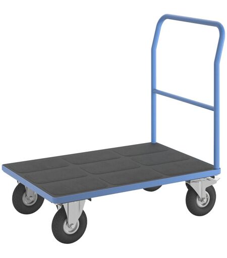 Chariot plate-forme, barre de poussée tubulaire, pneumatiques, L x l 1050 x 700 mm, bleu clair. Produit livré = démonté. Force = 300 kg. Equipement = avec barre de poussée tubulaire. Hauteur de chargement = 280 mm. Longueur = 1050 mm. Largeur = 700 mm. Hauteur barre de poussée = 1100 mm. Coloris du piétement = bleu clair RAL 5012. Bandages = pneumatiques. Diamètre roues = 210 mm. Roulement = roulement à rouleaux. Train de roulement = 2 roulettes fixes, 2 roulettes pivotantes avec dispositif de blocage. Coloris plateau = noir. Poids = 38.86 kg. Matériau plateau = plastique recyclé. Modèle barre de poussée = vissé fixe. Matériau du piétement = acier. Propriété = usure réduite. Force 300 kg. Surface de chargement résistante à l'usure, en plastique recyclé. Grand plateau pour le transport d'appareils et de matériaux encombrants. Usage polyvalent. Barre de poussée et roulettes pivotantes pour un déplacement aisé vers le lieu d'utilisation. Plateau antidérapant en plastique recyclé, robuste ...
