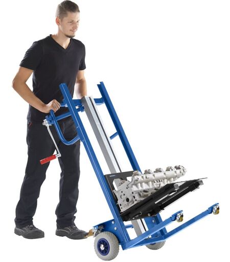 Diable élévateur, avec plate-forme, plage de levée 80 - 945 mm. Produit livré = en partie démonté. Version = avec plate-forme. L x l / Ø réceptacle = 600x430 mm. Charge max. = 120 kg. Centre de gravité = 300 mm. Plage de levée = 80 - 945 mm. Longueur = 925 mm. Largeur = 575 mm. Hauteur = 1265 mm. Hauteur du sol = 75 mm. Matériau = acier. Propriété = manuel. Surface = peint époxy. Coloris = bleu sécurité RAL 5005. Fonction diable pour de longs trajets. Positionnement précis sur 4 roues. Dispositif de réception des charges échangeable. Diable élévateur avec divers dispositifs de réception des charges pour de multiples applications. Centre de gravité à 300 mm. Roues anti-crevaison à frein central et 2 roulettes pivotantes pour un déplacement et un positionnement précis. Levée effectuée au moyen d'un treuil de sécurité et d'une chaîne à rouleaux de précision. Plate-forme de grande taille pour de nombreuses applications. Peinture dans toutes les teintes RAL. Supplément de prix seulement 10 ...