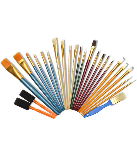 Les pinceaux de cette série sont faits de poils de haute qualité et avec de long manche. Ce lot est approprié pour l'acrylique, l'aquarelle, ainsi que la peinture à l'huile et ravira les débutants comme les peintres amateurs. - 2 pinceaux en mousse : taille 1" - 1 pinceau large de 1" - 2 pinceaux plats - poils synthétiques:0, 2, 3/4 et 1" - Pinceaux à poils naturels: Taille 2, 3, 4 et 6 - Pinceaux ronds synthétiques: 0 et 3 - Pinceaux ronds poils naturels: tailles 5/0, 2, 4, 6 et 8 - Pinceaux brosses ronds (blanc) : 0 et 3 - Pinceaux brosses plats (blanc) : 4 et 6 - Pinceaux brosses oblique (blanc) : 3/8" - Langues de chat: 1/8 et 1/2" ...