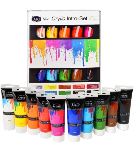 Set intro Artina crylic Ces couleurs acryliques ont des propriétés remarquables qui en font un produit extrêmement attrayant. En raison de leurs très bonne résistance à la lumière et leurs pouvoir couvrant ces couleurs sont aussi bien appropriées pour les artistes amateurs, que pour les peintres professionnels. Peinture soluble à l'eau et étanche après séchage. Fabriqué à partir de pigments de haute qualité. Peintures acrylique Artina sont très économique. Caractéristiques du produit: Excellente résistance des couleur Haute pigmentation et brillance des couleurs Séchage rapide Très bon pouvoir couvrant Très bonne résistance à la lumière Imperméable et flexible après séchage Diluable à l'eau Couleurs contenues de la livraison?: Blanc titane Jaune cadmium Vert jus Rouge écarlate Bleu outremer Noir Ombre brûlée Orange jaune Primaire rouge BleuCiel ...
