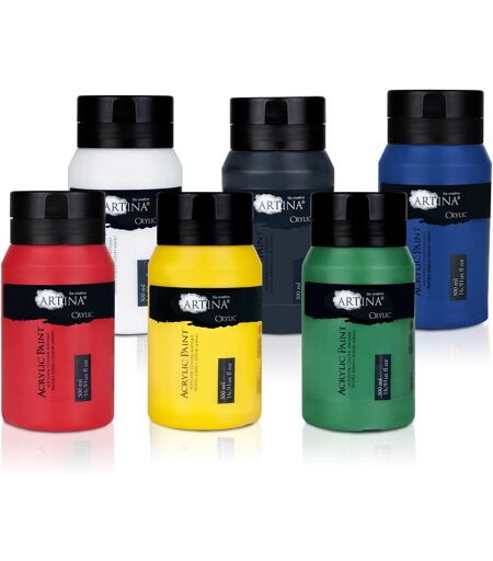 Avec ce lot de peinture acrylique Artina vous pourrez expérimenter de nouveaux mélanges et créer des contrastes au gré de votre inspiration grâce à cet ensemble de 6 couleurs acryliques en en bouteilles de 500ml. Couleurs du coffret: Blanc Titane Jaune de cadmium moyen Vert Feuilles Rouge écarlate Bleu outremer Noir ...