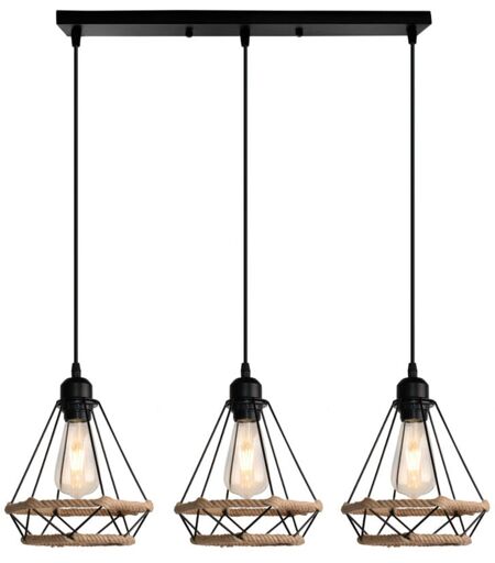 NORCKS Suspension Luminaire En Corde De Chanvre 20CM Plafonnier D'Intérieur Rétro Noir Lustre Diamant 3 Lumières Suspension Lustre Vintage En Métal