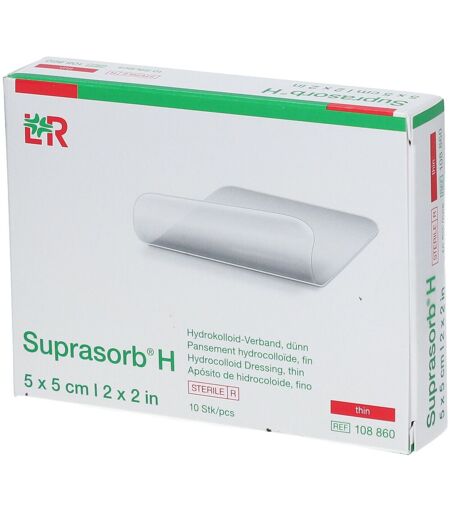 Taille du pansement: 5 x 5 cm Indication:Pour le traitement des plaies non infectées faiblement à modérément exsudatives et superficielles. ulcères de la jambe et ulcères de pression brûlures au 1er et 2e degré sites de prélèvement de greffes ulcères diabétiques plaies chirurgicales écorchures Description du produit:Le pansement Suprasorb H est constitué d'une matrice hydrocolloïde absorbante apposée sur une couche vectrice respirante en polyuréthane. La matrice hydrocolloïde absorbe rapidement l'exsudat et forme un gel cohésif. En plus d'une excellente capacité d'absorption, la couche vectrice respirante en polyuréthane offre une excellente perméabilité à la vapeur d'eau. L'association de ces propriétés assure un environnement humide optimal pour la plaie, minimise le risque de lésions de la peau périlésionnelle saine et permet une durée de port pouvant aller jusqu'à sept jours. Grâce aux différentes versions de Suprasorb H (standard, fin, sacrum, border), il est possible de traiter différentes indications. excellente capacité d'absorption Respirant assure un environnement de la plaie humide optimal risque minimisé de lésions de la peau périlésionnelle saine Conseils d'utilisation:Après nettoyage et désinfection approfondis du site de ponction et de la peau environnante, le pansement est appliqué sur une peau sèche. CompositionFilm en polyuréthane avec couche hydrocolloïde. Conditionnementpansements x10 ...