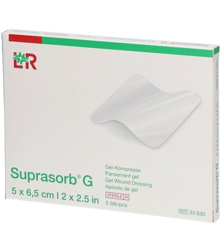 Taille du pansement: 5 x 6,5 cm Indication: plaies sèches à faiblement exsudatives plaies superficielles, aiguës ou chroniques, par ex. :ulcères variqueuxescarresbrûlures au 1er et 2e degrébrûlures Phases de cicatrisation :Phase exsudativePhase de granulationPhase d’épithélialisation Description du produit:Les pansements gel Suprasorb G éprouvés de L&R sont disponibles dès maintenant en nouvelle qualité. L'hydrogel dissout en douceur les débris, nécroses et débris tissulaires au plus profond du lit de la plaie et les emprisonne. Le pansement gel Suprasorb G offre un milieu humide, soulage la douleur et assure un excellent confort au patient. Chez les médecin et le personnel soignant le pansement gel de qualité se distingue par une application simple et une manipulation aisée. dissout les nécroses en préservant les tissus et les absorbe dans le gel émission importante d'humidité pour un débridement autolytique efficace crée un milieu humide et soulage la douleur liée à la plaie bonne modelabilité Conseils d'utilisation:Suprasorb G Gel peut être appliqué au-delà des berges de la plaie et découpé si nécessaire à la taille de la plaieLe film transparent doit être posé à nouveau avant l'utilisation sur la compresse de gel s'il adhère sur l'intérieur de l'emballage individuel. Des gants doivent être alors portés ou une pincette, utilisée. Compositioneau, polymère acrylique sur la base d'un dérivé de taurate, polyéthylène, phénoxyéthanol Conditionnementpansements x5 ...
