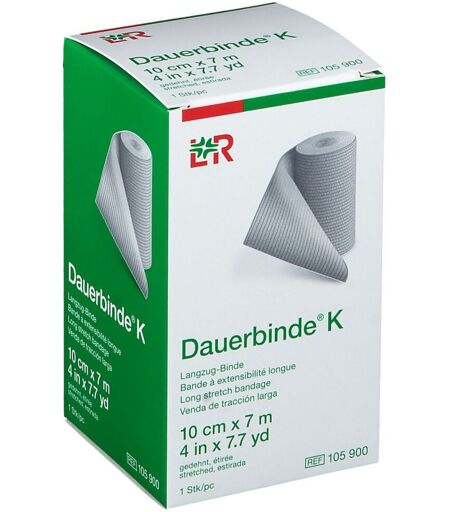 Dauerbinde® K Bande à allongement long 10 cm x 7 m. Indication Bande de compression et de soutien. Composition 58 % CO, 24 % PA, 8 % EL, 10 % VI. Conditionnement 1 rouleau ...