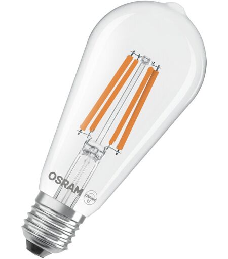 Lampes à LED, forme edison classique, CLASSE D'EFFICACITÉ ÉNERGÉTIQUE A. Caractéristiques du produit: Lampes LED disponibles pour tension secteur. Ouverture du faisceau : jusqu'à 300°. Très longue durée de vie allant jusqu'à 30 000 heures. Très grand nombre de cycles de commutation: jusqu'à 300.000. Efficacité lumineuse : jusqu'à 210 lm/W. Avantages du produit: Lampes avec technologie de « filament » LED innovante. Conception, dimensions, flux lumineux comparables à une lampe halogène. Faible consommation d'énergie. Allumage instantané. Effets de scintillement et stroboscopiques réduits. Zones d'application: Idéal pour les installations décoratives. Applications domestiques. Éclairage général. Utilisation en extérieur uniquement dans des luminaires d'extérieur appropriés. ...