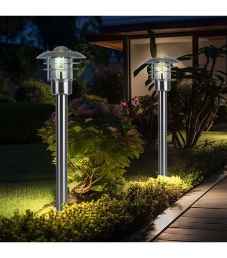 la description Des classiques absolus, rien de plus à dire là-dessus ! Ces lampes d'extérieur incarnent une apparence toujours classique et sont idéales pour l'ensemble de l'espace extérieur de votre jardin. Devant les entrées de la maison ainsi que dans tout le jardin de devant, sur la terrasse ou dans votre jardin comme éclairage de chemin, ils fournissent un éclairage suffisant. L'ampoule n'est pas incluse dans la livraison. Deux luminaires extérieurs sont inclus dans la livraison. Lampe de détail • Type de luminaire : luminaire de chemin • Matériau : métal • Couleur : acier inoxydable brossé • Degré de protection : IP44 • Longueur x largeur x hauteur en cm : 22 x 22 x 80• Poids en kg : 1,29 • Ampoule : E27 • Ampoule incluse : non• Puissance de la lampe : 1 x 46 W maximum (watts) • Alimentation : 230 V, 50 Hz ...