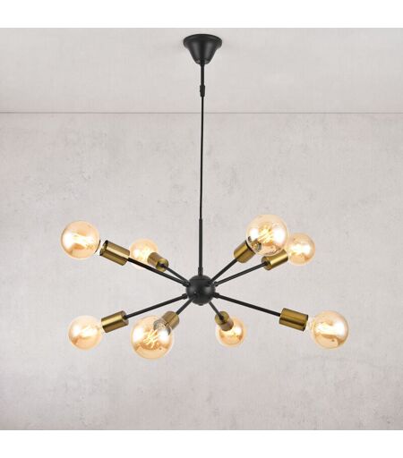 Lampe suspendue moderne Cette suspension décorative à 8 branches s'inspire par les tendances actuelles, elle est le choix idéal pour embellir votre salle à manger, salon ou chambre. Description : - suspension à 8 culots - éclairage efficace - design original - hauteur réglable Données techniques : - alimentation : 230V, 50Hz - type d'interrupteur : mural - culot : 8 x E27 max. 60W (les ampoules ne font pas partie de l'offre) Matière : métal Couleur : noir / laiton Dimensions : - hauteur : ca. kb. 150 cm avec câble - longueur du câble : ca. 40 - 110 cm (réglable) - diamètre : ca. 56 cm - longueur des branches : ca. 25 cm (sans agents lumineux) - diamètre de la partie de fixation au plafond : 11 cm Contenu de la livraison : 1 x suspension (livraison sans ampoules) Produit de la marque [lux.pro]. ...