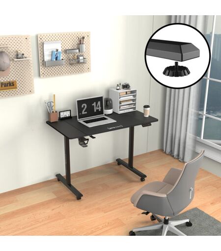 Bureau réglable en hauteur La hauteur de cette table est réglable en hauteur par l'appui de touche. Ainsi vous pouvez créer un espace de travail ergonomique en alternant les positions (entre assis et debout). La fonction mémoire vous permet de sauvegarder 2 hauteurs différentes, ainsi le changement de position se fait facilement et rapidement. Les 4 roulettes peuvent être montées à la place des vis de réglage, ce qui vous donne la flexibilité de déplacer la table. Description : - pour travail assis ou debout - idéal pour des bureaux et espaces de travail - structure réglable en hauteur en continu (1 cm / seconde) - fonction mémoire pour le paramétrage facilité des positions optimales - avec des range-câbles sous le plateau - avec porte-gobelet et porte-casque - tapis de souris XXL amovible - 4 roulettes pour un déplacement facile - montage simple et rapide - arrêt automatique en cas d'obstacle - moteur silencieux - plateau uni - capacité de charge jusqu'à 60 kg Forme : rectangulaire ...