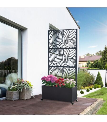 Cloison avec jardinière Cette élégante cloison avec jardinière est idéale pour structurer vos espaces intérieurs et extérieurs. Que ce soit dans le salon, le bureau, le jardin, sur la terrasse ou le balcon, elle s’intègre parfaitement à son environnement. À la fois brise-vue et séparation d’espace, elle protège du vent et du soleil tout en préservant votre intimité. Son motif décoratif apporte une touche de modernité et d’élégance à votre aménagement. Facile à monter, elle est équipée de quatre roulettes dont deux avec freins, permettant un déplacement aisé et une stabilité optimale. Son atout principal : une jardinière intégrée pour mettre en valeur vos plantes et fleurs de façon originale. Points forts : - paravent avec bac à fleurs intégré - convient pour l'intérieur et l'extérieur - offre une protection attrayante contre les regards et le vent - idéal pour délimiter différentes zones - 4 roulettes au total pour un placement flexible - 2 roulettes avec freins de blocage pour une ...