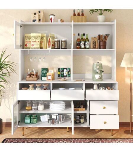 Fairwhale - Meuble haut restaurant 145x39x171cm blanc/doré - Porte vitrée Changhong, support verres à vin - Rangement multicouche