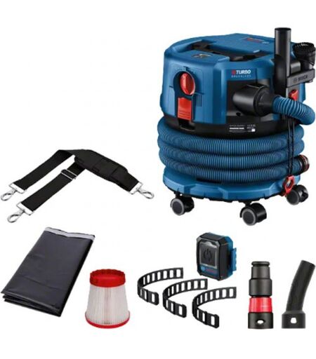 Aspirateur eau et poussiere 18V de classe M avec nettoyage de filtre semi-automatique Une seule batterie 18V suffit pour cet aspirateur BITURBO puissant et compact de classe M Apres l’avoir appairé au module émetteur GCT 30-42, il se mettra en marche et s’arretera automatiquement en meme temps que votre outil électroportatif Grand pouvoir aspirant grâce a la technologie BITURBO Brushless, au filtre de plus grande taille et a la technologie cyclonique Fonctions et principales caractéristiques Inclus dans cette variante Adaptateur de buse Référence: 2 608 000 585 Suceur droit Référence: 2 608 000 768 Sac jetable Référence: 2 608 000 773 Tuyau de 3 m, antistatique Référence: 2 608 000 772 Coude Référence: 2 608 000 769 Filtre HEPA, classe M Référence: 2 608 000 771 Brosse Référence: 2 608 000 770 Bandouliere Référence: 1 607 000 F3J 3 bandes élastiques Référence: 1 600 A03 0F0 GCT 30-42 Référence: 1 600 A02 GG1 CARACTÉRISTIQUES TECHNIQUES Tension de la batterie 18,0 V Poids sans batterie* 8 kg Largeur nominale tuyau d’aspiration 28 mm Surface de filtration 3 200 cm2 Débit maxi (turbine) 30 l/s Dépression maxi. (turbine) 170 mbar Contenance brute de la cuve 12 l Contenance nette de la cuve 8 l Contenance nette de la cuve eau 6 l Classe de filtration aspirateur pour solides / liquides M Classe de filtration M Dimensions de l’emballage (longueur x largeur x hauteur) 390 x 445 x 500 mm Nombre de dents 5 Roue, diametre 50 mm Systeme de nettoyage de filtre SFC Tuyau antistatique Oui GAS 18V-12 MC PROFESSIONAL: INFORMATIONS COMPLÉMENTAIRES Points forts du produit L’aspirateur sans-fil GAS 18V-12 MC est conforme a la classe de protection M. Il permet d’aspirer la majorité des poussieres produites sur un chantier, notamment les poussieres de béton, brique, mastic, plâtre, mortier-joint. Le systeme antistatique innovant évacue automatiquement les charges électrostatiques produites et le systeme Auto-Start se charge de mettre en marche et d’arreter l’aspirateur a votre place, pour que vous puissiez vous concentrer pleinement sur le travail a effectuer. Il suffit pour cela de fixer le module émetteur GCT 30-42 a votre outil et de l’appairer au GAS 18V-12 MC. Apres l’appairage, le systeme Auto-Start détecte les vibrations de l’outil pendant son utilisation et active/désactive automatiquement l’aspirateur a votre place. Le puissant moteur BITURBO Brushless et le filtre de plus grande taille garantissent un tres bon pouvoir aspirant pour tous les travaux exigeants et ce, avec juste une batterie 18V. Équipement et application Compatible avec le Professional 18V System Bosch et avec l’alliance batteries multimarques AMPShare.> ...