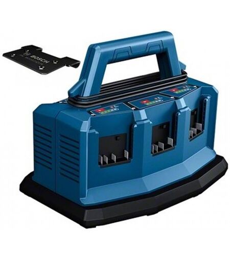 GAL 18V6-80 Professional Chargeur Charge en continu pour un travail sans pause forcée : chargeur multi-baies pour 6 batteries Charge rapide avec un courant de 8 A : 42 min suffisent pour recharger a 80 % une batterie ProCORE18V 8.0Ah Grande efficacité : grâce a 2 cycles de charge assurant un travail en continu Touche charge prioritaire : permet de charger en priorité la batterie correspondante Fonctions et principales caractéristiques Inclus dans cette variante Boîte carton Adaptateur L-BOXX pour GAL 18V6-80 Caractéristiques techniques Tension de charge de la batterie 14,4 – 18 V Courant de charge* 8 A Durée de charge approximative pour une capacité de batterie de 2,0 Ah (80 %/100 %)* 16/24 min Durée de charge approximative pour une capacité de batterie de 4,0 Ah (80 %/100 %)* 23/37 min Durée de charge approximative pour une capacité de batterie de 5,0 Ah (80 %/100 %)* 28/47 min Durée de charge approximative pour une capacité de batterie de 6,0 Ah (80 %/100 %)* 32/57 min Durée de charge approx. (80 %/100 %) pour ProCORE18V 4.0Ah* 32/50 min Durée de charge approx. (80 %/100 %) pour ProCORE18V 8.0Ah* 42/68 min Durée de charge approx. (80 %/100 %) pour ProCORE18V 12.0Ah* 65/96 min Poids* 1,8 kg Dimensions de l’emballage (longueur x largeur x hauteur) 243 x 310 x 220 mm Tension de la batterie 18,0 V GAL 18V6-80 Professional: Informations complémentaires Points forts du produit Le GAL 18V6-80 permet une recharge en continu en deux phases pendant la journée de travail ou la nuit. Lors de la premiere phase, les batteries insérées dans les logements (jusqu’a six au total) sont rechargées successivement a 80 %. Lors de la seconde phase, les batteries sont chargées jusqu’a 100 %. Grâce au courant de charge de 8 A, les batteries ProCORE18V 8.0Ah sont chargées a 80 % en seulement 42 minutes. Les indicateurs de niveau de charge a 5 LED placés au-dessus des logements de charge renseignent de maniere précise sur la progression de charge de chaque batterie. Chaque logement de charge comporte en plus une touche Priorité permettant d’interrompre le cycle de charge normal pour charger en priorité l’une des batteries. L’outil est compatible avec toutes les batteries 18 V de Bosch Professional (Professional 18V System). Équipement et application Le chargeur multi-baies peut etre fixé au-dessus d’un coffret L-BOXX pour éviter tout basculement ou mouvement dangereux pendant le transport. La poignée du chargeur possede a chaque extrémité un ergot permettant d’enrouler le câble d’alimentation pour un transport facile et un rangement ordonné.> ...