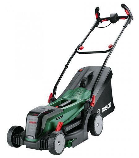 Bonnes performances de coupe, sac de collecte pratique pour les pelouses de moyenne a grande superficie Tres bonnes performances de tonte grâce au moteur sans charbon et a l’électronique 36 V (2 x 18 V) Des pelouses toujours impeccables grâce au sac de collecte en toile avec indicateur de sac plein Idéale pour la tonte de pelouses de moyenne et grande superficie avec de l’herbe courte ou haute Tondeuse tres performance grâce a la tension d’alimentation de 36 V obtenue avec 2 batteries de 18 V Technologie Syneon pour des performances optimales et une autonomie maximale Compatible avec les batteries 18V POWER FOR ALL Bosch Accessoires fournis Bac de ramassage d’herbe 40 l avec indicateur de bac plein Carton Caractéristiques techniques • Tension de la batterie: 2 x 18 V • Compatibilité de la batterie: 18V POWER FOR ALL ALLIANCE • Recommandation batterie: >= 4,0 Ah • Temps de charge de la batterie: 95 min • Durée de charge rapide batterie: Rechargée a 80 % en 65 min • Surface de pelouse recommandée: Jusqu’a 550 m2 • Diametre de coupe: 37 cm • Systeme de coupe: Lame circulaire • Bac de ramassage: 40 L • Hauteur de coupe: 25 – 70 mm • Réglage de la hauteur de coupe: Réglage sur 5 positions, centralisé • Type de poignée: Systeme « Ergoflex » • Dimensions (L x l x H): 1355 x 400 x 1050 mm • Poids: 13,7 kg • Hauteur de coupe, de: 25 mm • Hauteur de coupe, jusqu’a: 70 mm Des grandes pelouses toujours soignées et bien nettes grâce aux systemes de tonte et de collecte tres performants La tondeuse a gazon sans fil UniversalRotak 2x18V-37-550 impressionne par sa puissance et son confort d’utilisation. Elle est idéale pour tondre de l’herbe haute et de l’herbe courte sur des pelouses de moyenne a grande superficie grâce a son électronique 36 V (2 x 18 V) et son moteur sans charbon garantissant des coupes performantes et une durée de vie élevée. Cette tondeuse se distingue par sa largeur de coupe de 37 cm et sa hauteur de coupe réglable dans 5 positions entre 25 mm et 70 mm au moyen d’un levier central. Les utilisateurs apprécieront les poignées Ergoflex, le sac en toile de 40 litres rétractable qui collecte l’herbe fraîchement coupée et l’indicateur de niveau qui les informe quand le sac est plein. La technologie Syneon Bosch garantit des performances optimales et une autonomie maximale. L’outil fait partie du systeme 18V POWER FOR ALL.> ...