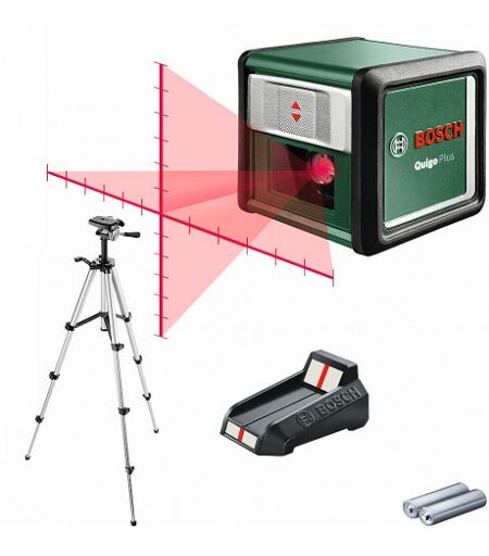 Un atout indéniable pour l’aménagement créatif Projection simultanée d’une ligne laser horizontale et d’une ligne laser verticale Marquage a égale distance ou a distance variable grâce aux reperes des lignes laser Les lignes laser sont automatiquement de niveau, meme si l’outil est posé sur des surfaces légerement inégales. Parfait pour poser rapidement des objets de décoration, des cadres, des étageres, du papier peint, des frises ou du carrelage Réglage de hauteur précis et positionnement souple grâce au trépied fourni avec l’outil Dispose de caractéristiques écoresponsables, voir ci-dessous pour plus de détails Accessoires fournis: Quigo Plus • 2 piles 1,5V LR03 (AAA) • Platine de mesure • Trépied aluminium 1,1 m • Carton Caractéristiques techniques • Diode laser: 635 nm • Classe laser: 2 • Durée de la mise a niveau automatique, typ.: 6 s • Plage de mise a niveau automatique: ± 4 ° • Précision**: ± 0,8 mm/m • Filetage du trépied: 1/4" • Poids: 0,270 kg • Pile: 2 x 1,5-V-LR03 (AAA) Un outil tres pratique pour tracer des traits équidistants sur un mur Du style et du génie ! Le Quigo Plus est l’outil idéal pour la création de motifs et de designs originaux sur les murs. Il permet d’effectuer des marquages a égale distance ou a distance variable grâce aux reperes des lignes laser. Comme il projette simultanément une ligne laser horizontale et une ligne laser verticale, il permet d’aligner les objets et les motifs avec facilité et précision, d’autant plus que les lignes se mettent a niveau automatiquement. Il permet aussi de poser des objets décoratifs, des cadres, des étageres, du papier peint ou du carrelage avec rapidité et précision (+/-0,8 mm/m) mais aussi d’aligner divers autres objets. Sa commande par un simple cache coulissant facilite l’utilisation. L’outil dispose d’une plage d’auto-nivellement de +/-4° et projette une croix laser parfaitement de niveau, ce qui permet d’effectuer des alignements faciles et précis sur des murs. Il est fourni avec un trépied pour des réglages de hauteur précis et une grande souplesse de positionnement. > ...